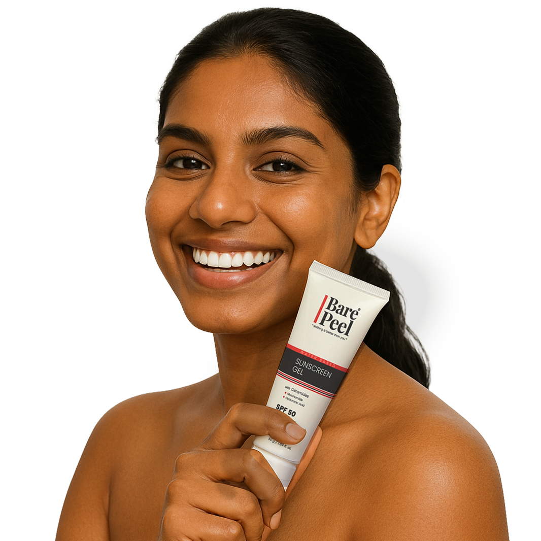 Bare Peel Sunscreen SPF 50+ Gel offers broad-spectrum protection with PA+++, shielding your skin from both UVA and UVB rays. While UVB rays cause sunburn, UVA rays penetrate deeper, leading to premature aging and pigmentation. Our advanced SPF 50+ formula defends against both, helping to prevent tanning, dark spots, and sun damage. Powered by a non-comedogenic, water-based gel, it’s perfect for daily wear—keeping your skin safe, clear, and protected even in harsh sunlight and urban pollution.